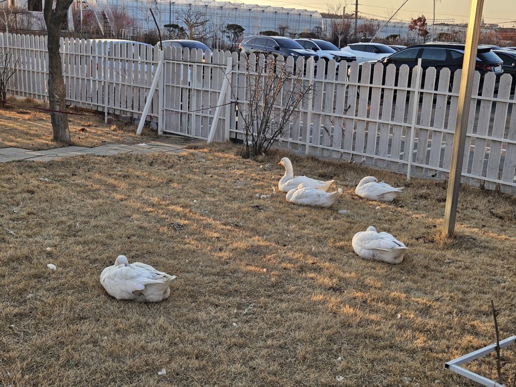 • 거위 생태 및 관찰: 카페 앞마당에서 흰 거위 5마리를 가까이서 볼 수 있습니다. 거위는 둥근 부리를 이용해 깨무는 습성이 있으므로 주의가 필요하며, 동절기에는 오후 5시 30분경부터 취침에 들어갑니다.